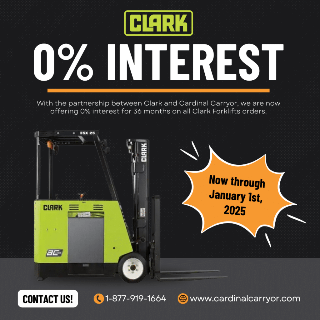From November 19, 2024, through January 1, 2025, enjoy 0% interest for 36 months on ALL Clark Forklift orders (except Class III models).